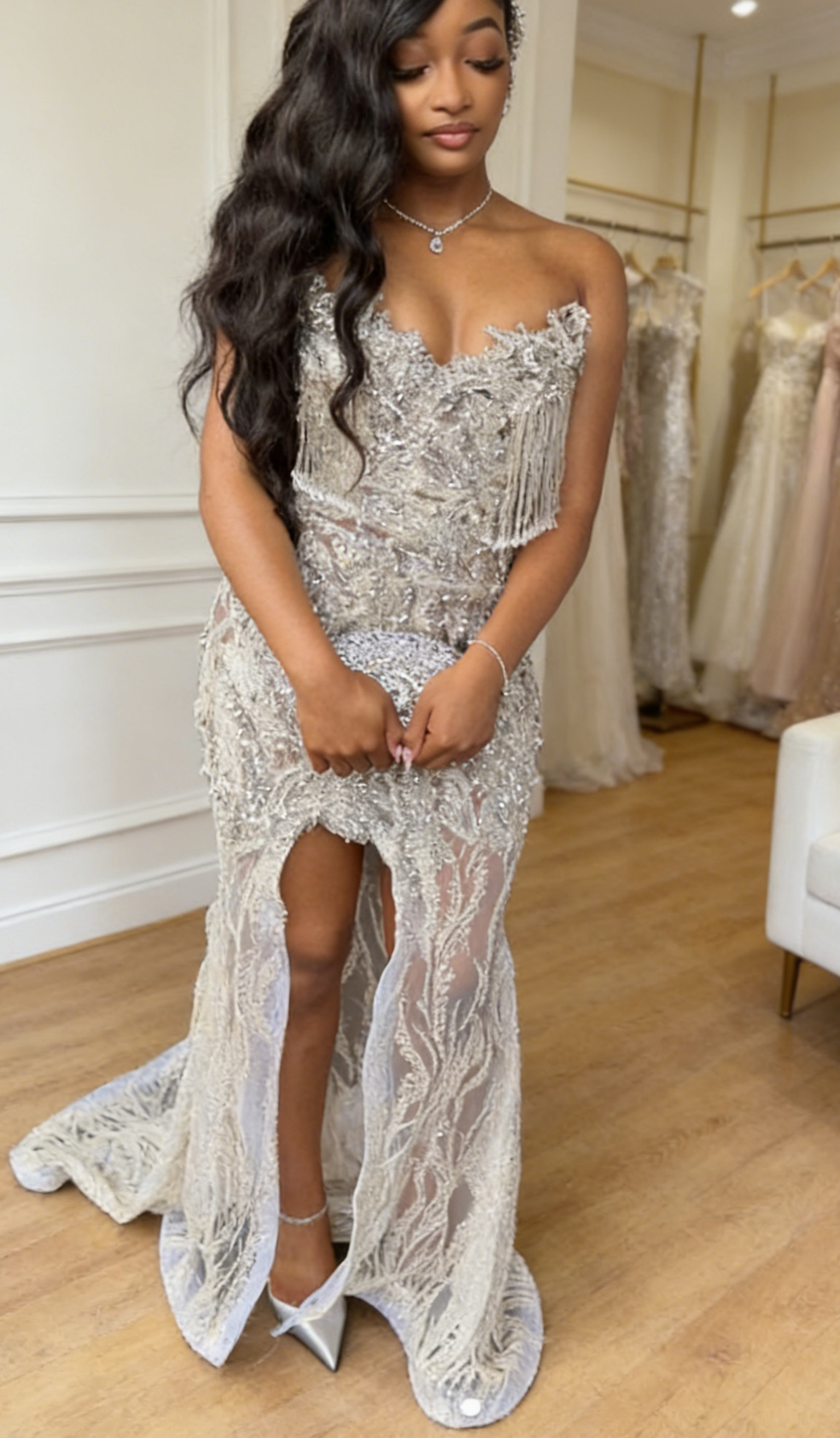 Elegantes silbernes langes Ballkleid mit Herzausschnitt, Tüll, Pailletten und Schlitz ED07324
