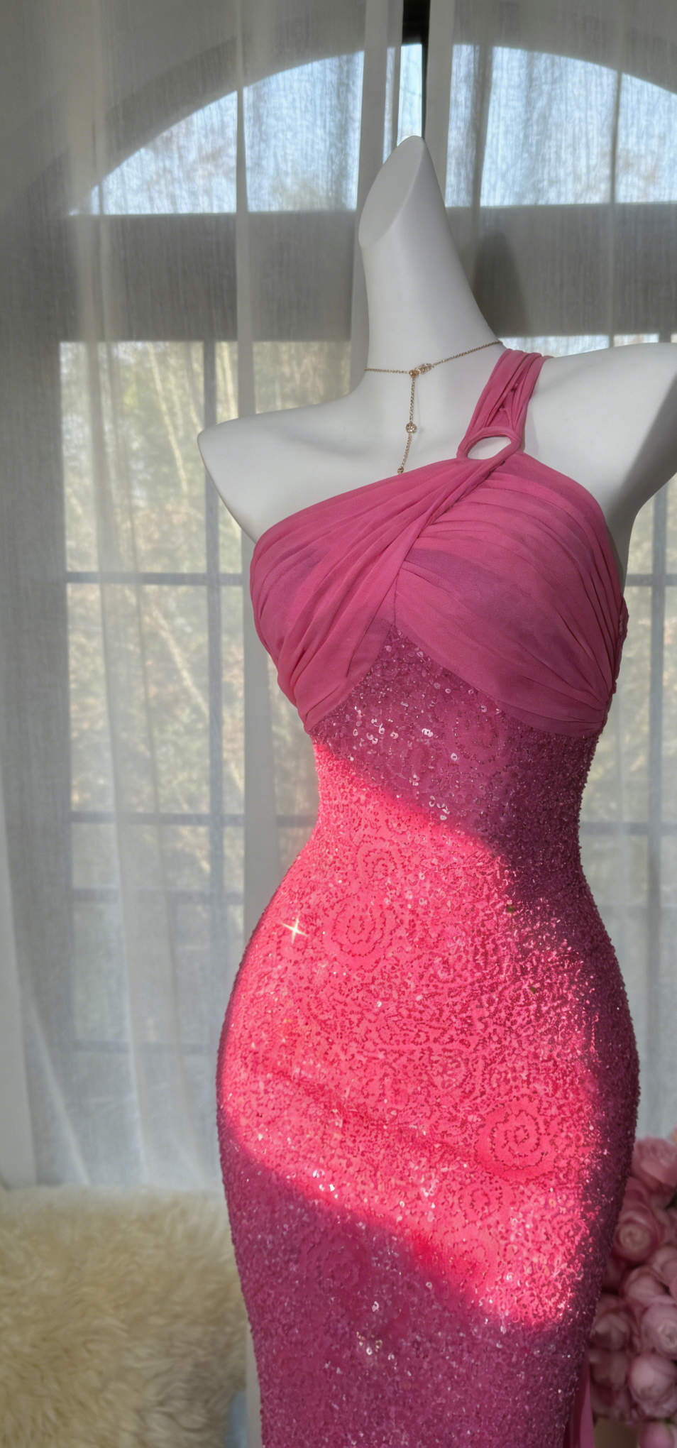 Chic Pink Long Prom Dresses One-shoulder Sheath Evening Dresses Tulle Beaded Birthay Dresses ED06147