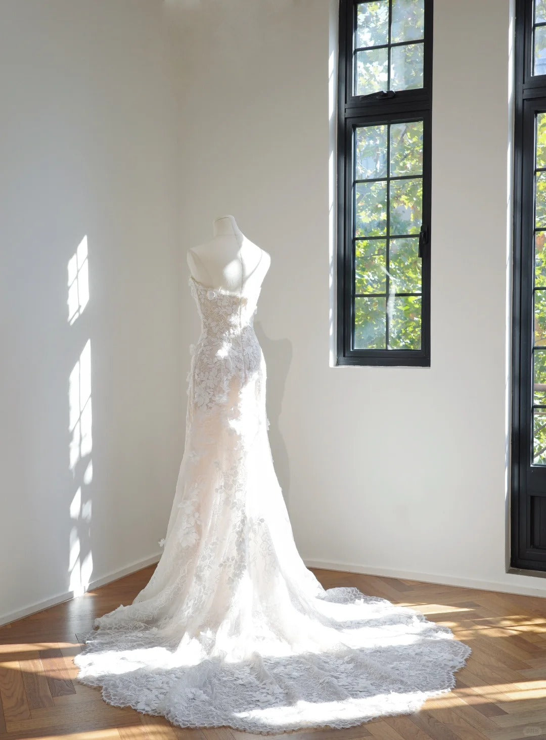 Chic Sheath Long Wedding Dresses Strapless Tulle Appliques White Bridal Dresses Sleeveless Bridal Gowns ED06217