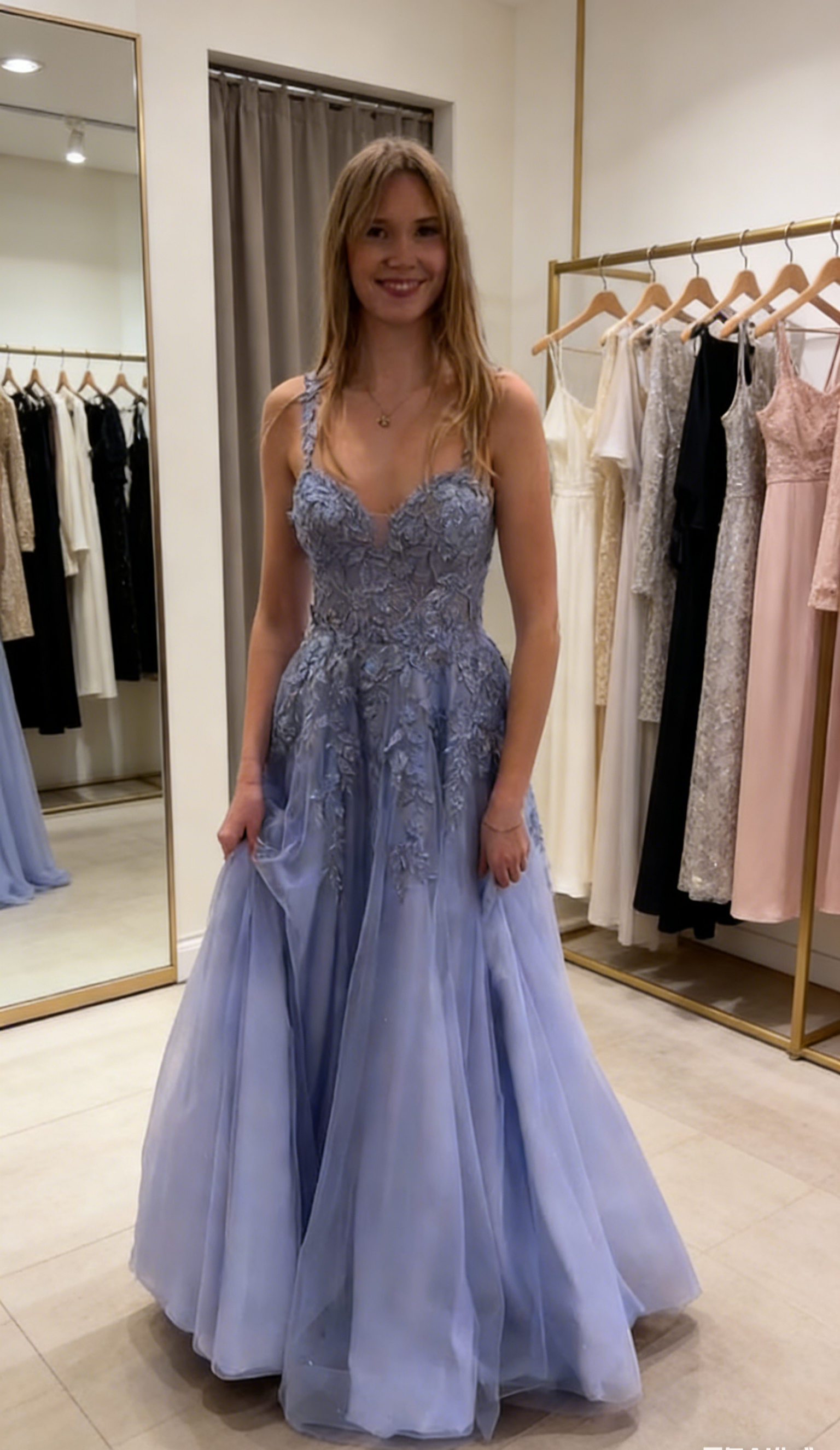Cute Long Purple Prom Dresses Spaghetti Straps A-Line Evening Dress Appliques Tulle Sleeveless Birthday Dress ED06706
