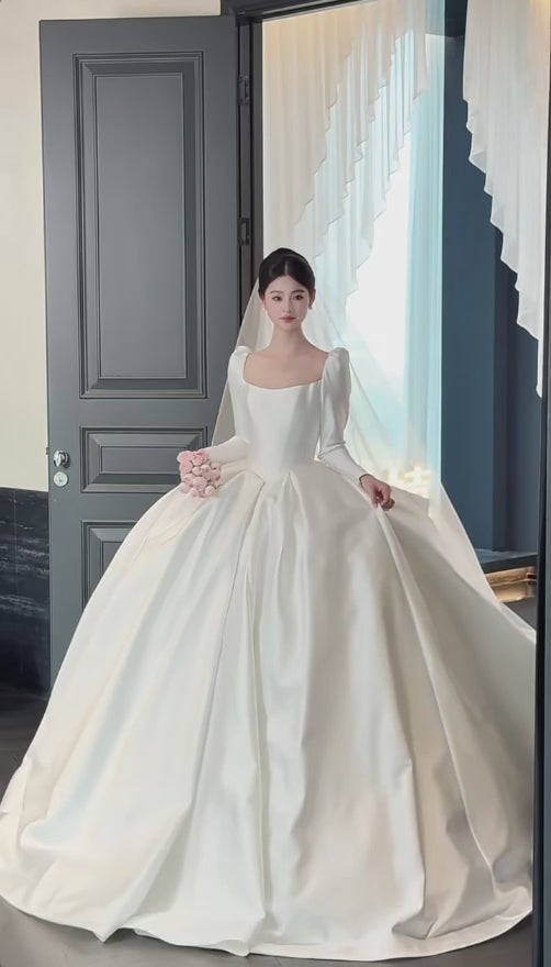 Simple A-Line Long Wedding Dresses Satin White Bridal Gowns Square Neck Long Sleeves Bridal Dress EP06525