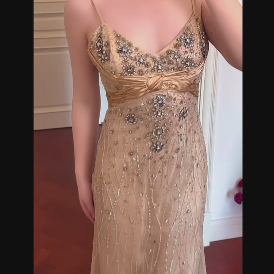 Vintage Gold Long Prom Dresses Chiffon Spaghetti Straps Sheath Evening Dresses Beaded Sleeveless Party Dresses ED06243