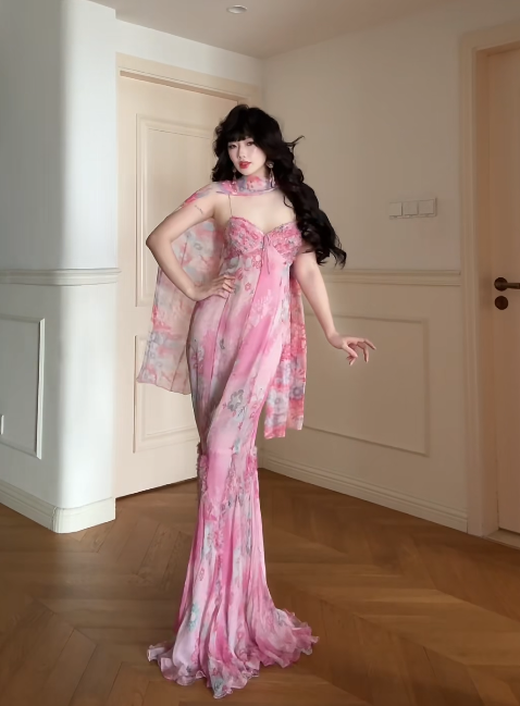 Chic Sheath Pink Long Prom Dress Chiffon Spaghetti Straps Evening Dress Sleeveless Party Dress ED06391