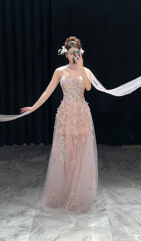 Chic Sheath Pink Long Prom Dresses Tulle Appliques Strapless Evening Dresses Sleeveless Pink Formal Dresses ED05431