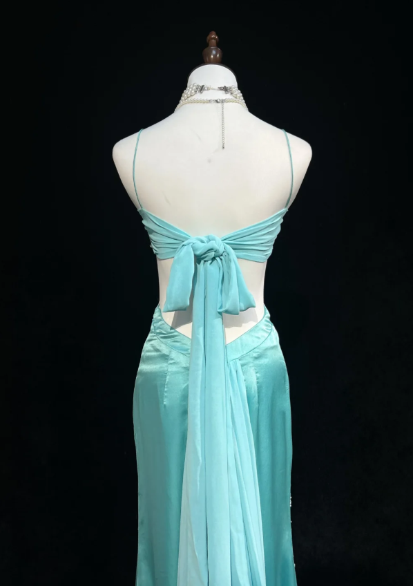 Chic Tiffany Blue Long Prom Dresses Beaded Satin Spaghetti Straps Sheath Evening Dresses ED06199