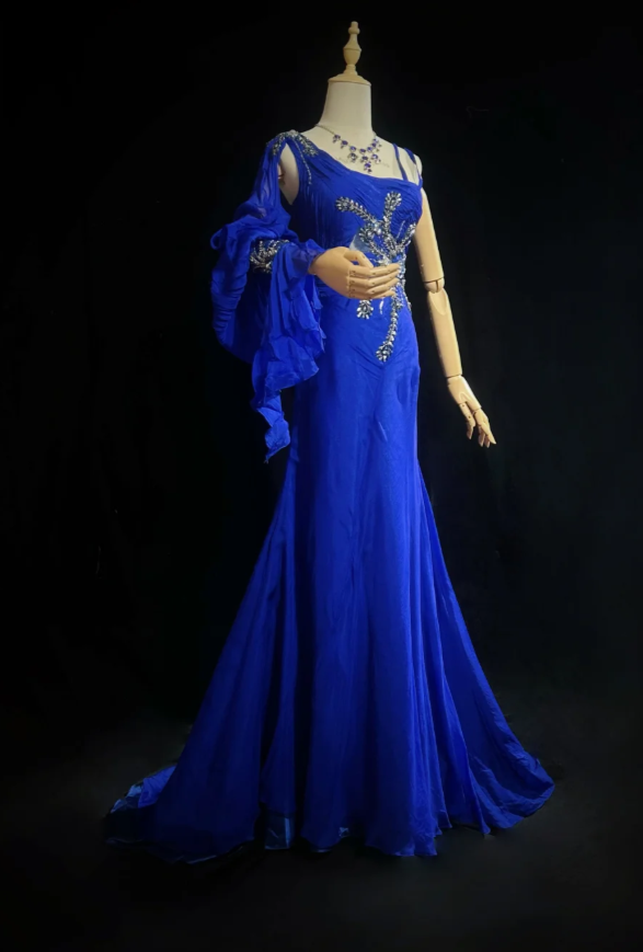 Elegant Sheath Royal Blue Long Prom Dress Sequin Chiffon Asymmetric Collar Evening Dress Sleeveless Birthday Dress ED06342