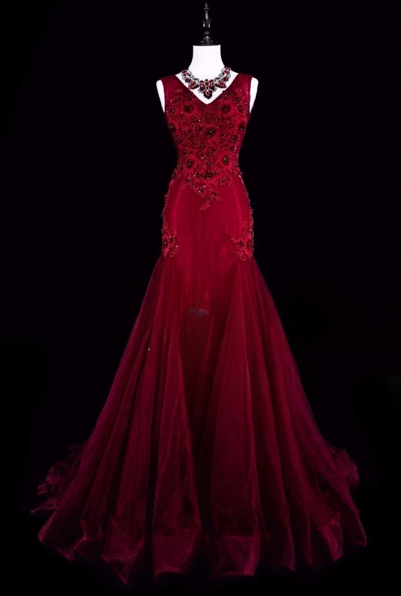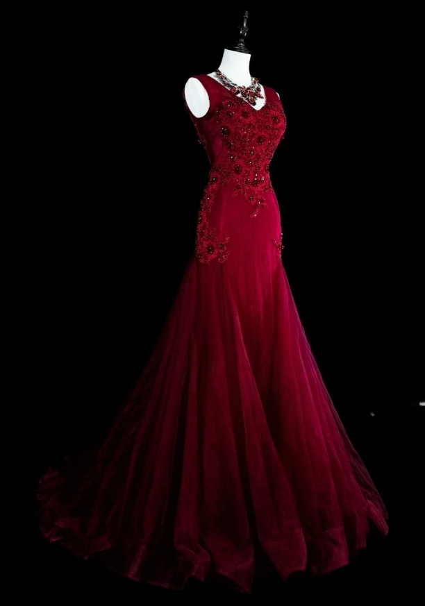 Gorgeous Mermaid Burgundy Long Prom Dress Applique Tulle Beaded V-neck Evening Dress ED06369