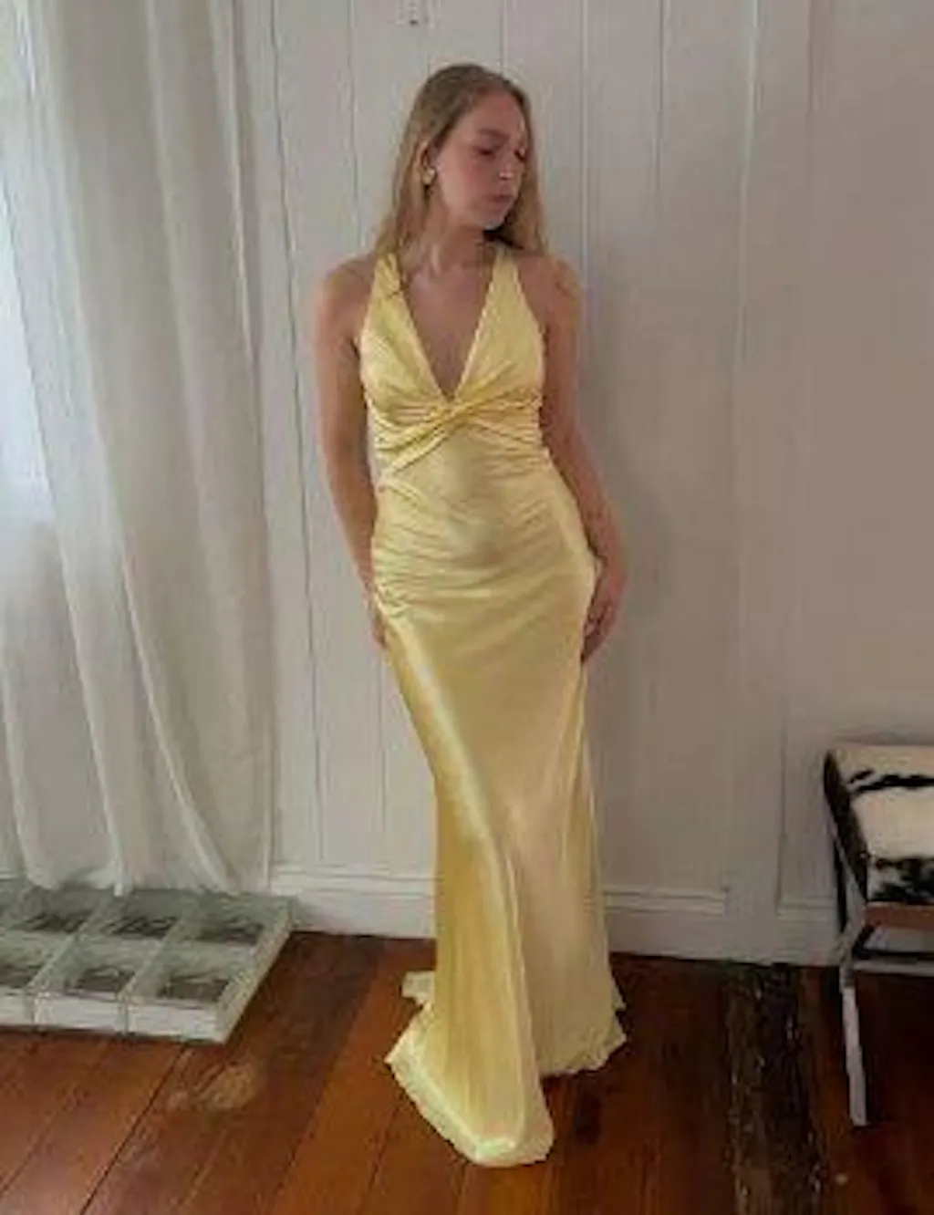Simple Yellow 💛A-Line Long Prom Dress for Party&Guest-V Neck Satin Beautiful Backless Formal Evening Dress