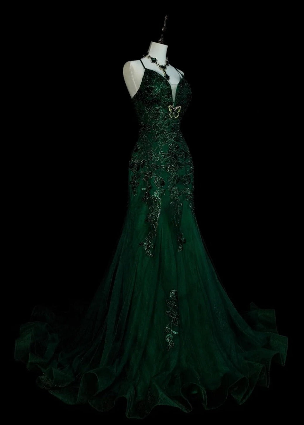 Gorgeous Dark Green Long Prom Dress Tulle Spaghetti Straps Sheath Long Evening Dress Appliques Sleeveless Birthday Dress ED06608