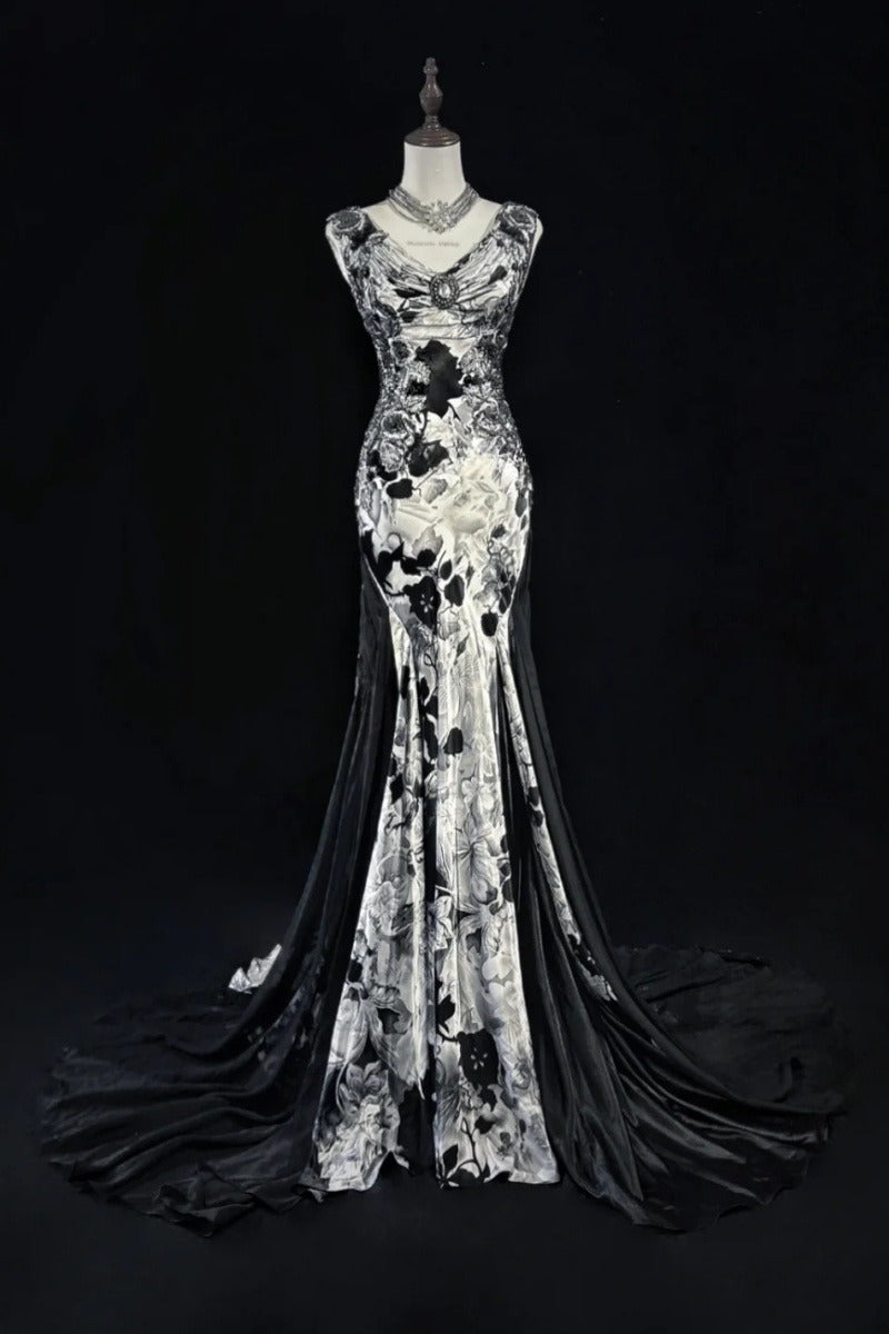 Vintage Black Floral Prom Dress V-neck Chiffon Sheath Evening Dress ED06777