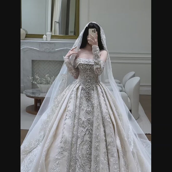 Chic A-Line Long Wedding Dresses Satin Beaded White Bridal Gowns Off-shoulder Cup Sleeves Bridal Dress EP06521
