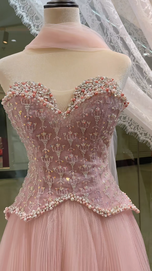 Chic Pink A-Line Long Prom Dresses Beaded Tulle Strapless Evening Dressses Sleeveless Birthday Dresses ED05844