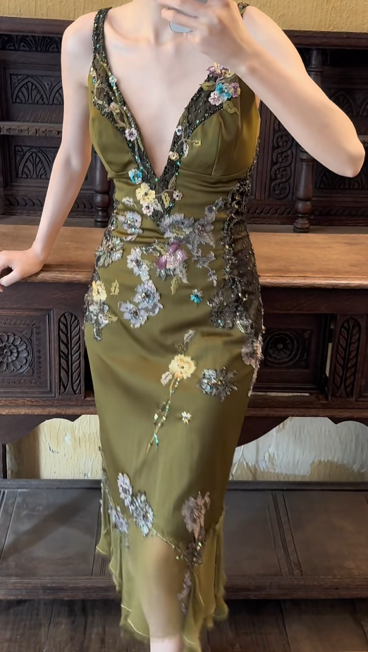 Vintage Olive Green Tea Length Prom Dress Chiffon Beaded Sheath Evening Gowns V-neck Birthday Dress ED06517