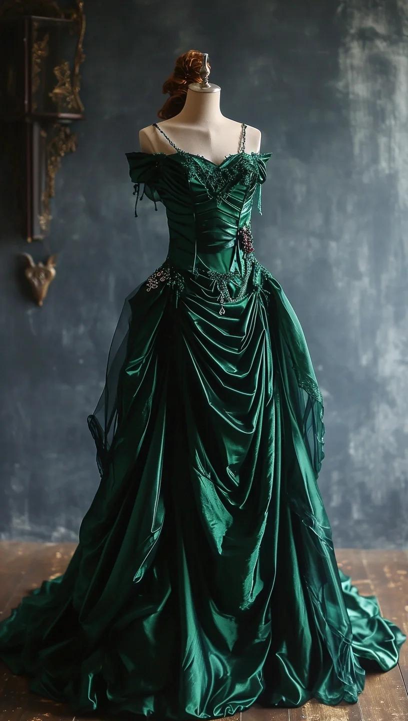 Classic Gothic Off-the-shoulder Ball Gown Satin Long Prom Dresses Dark Green Quinceaña Dresses ED04151