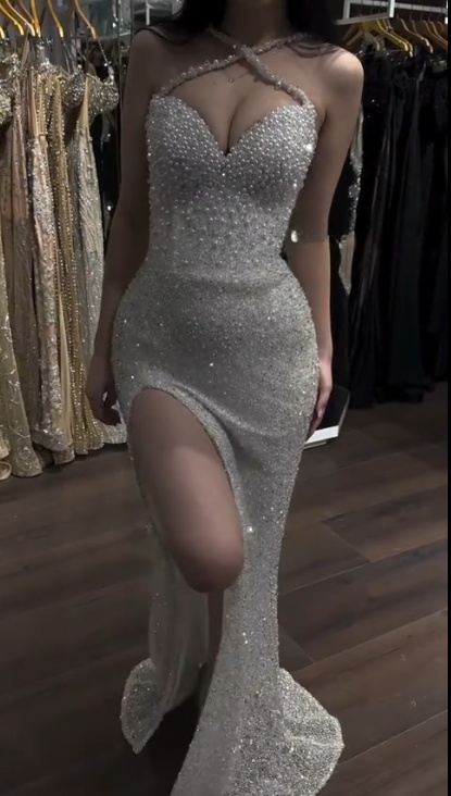Elegant White Mermaid Evening Gowns Halter Beaded Long Prom Dresses Sparkly Slit 23rd Birthday Dress ED03684