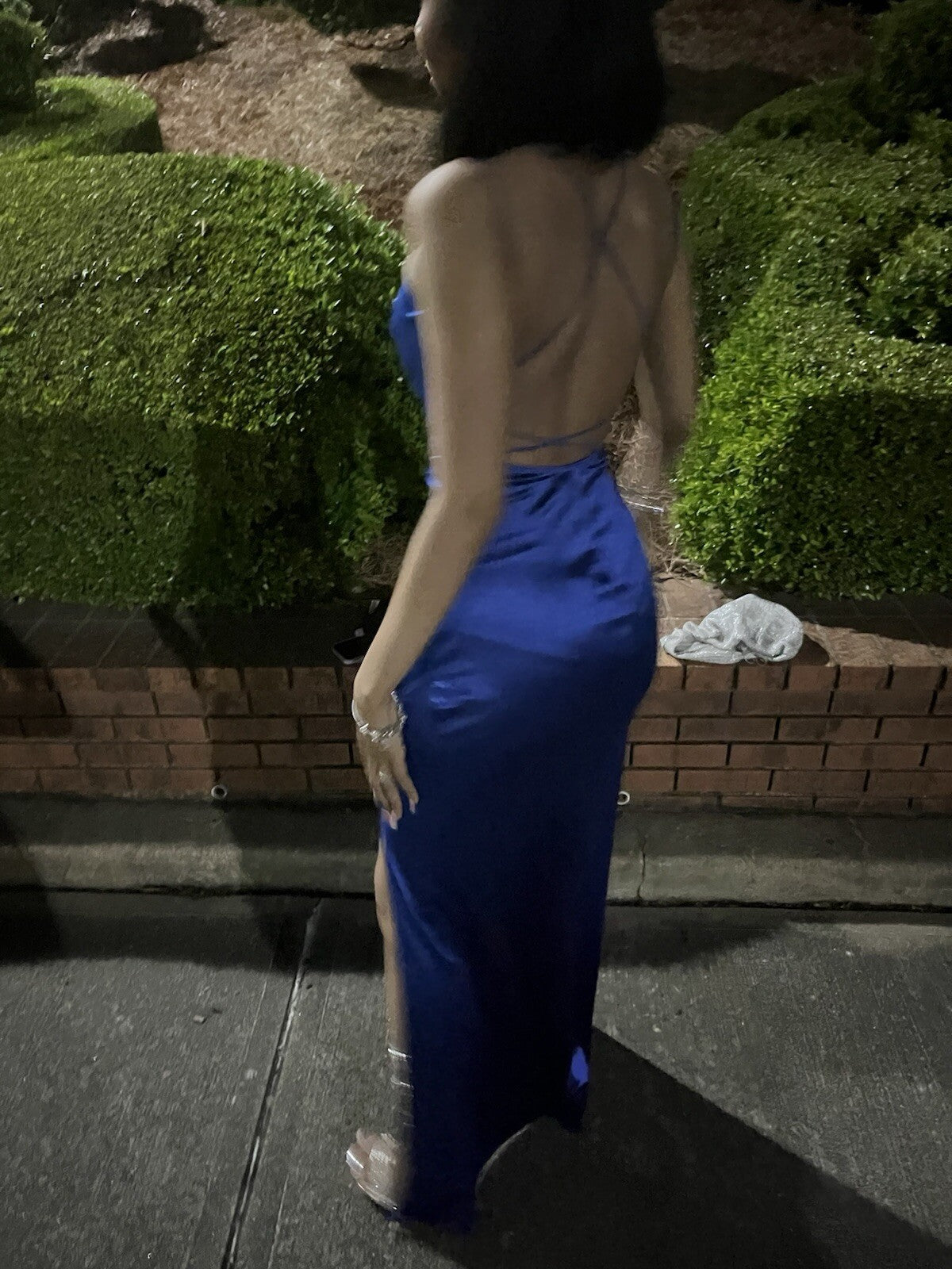 Sexy Spaghetti Strap Sheath Blue Long Prom Dresses with Open Back Satin Blue Slit Long Birthday Dresses ED04919