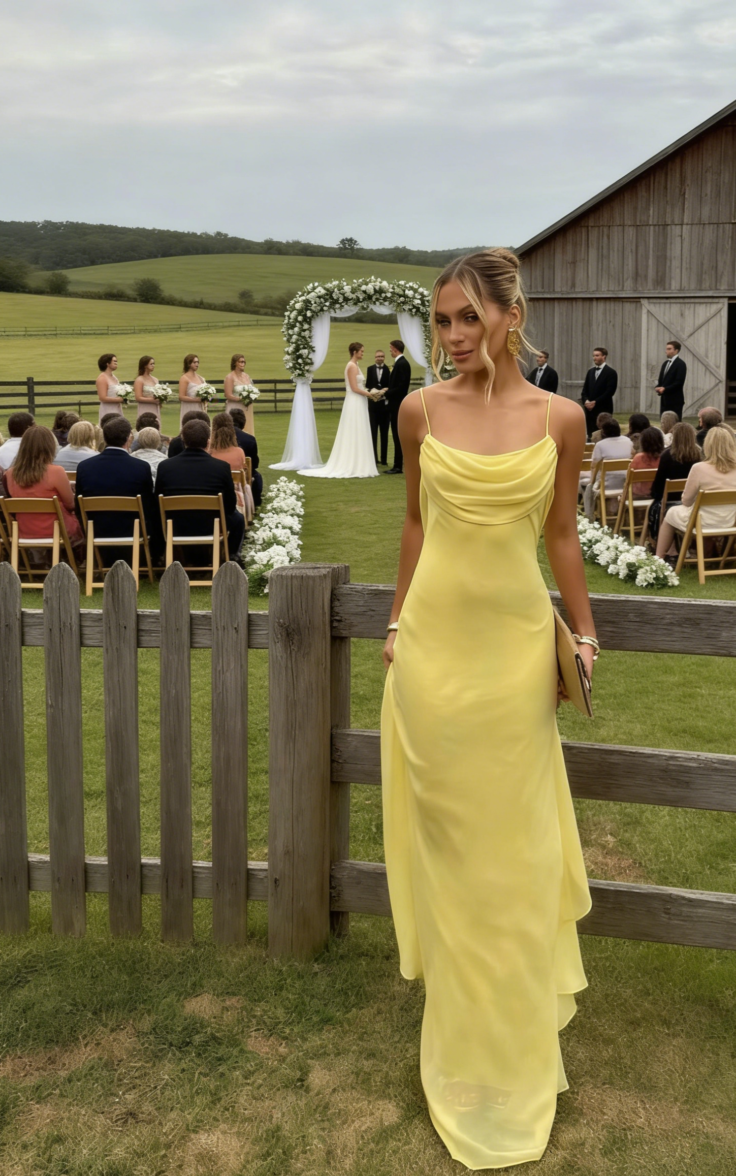 Simple Yellow Wedding Guest Dress Chiffon Sheath Spaghetti Straps Evening Dress ED06851
