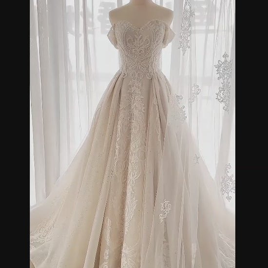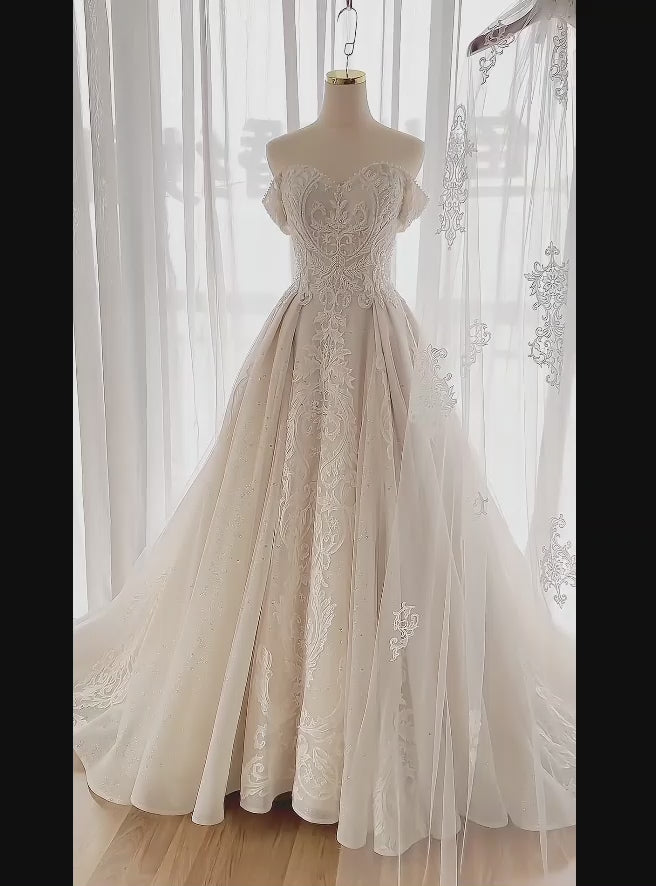 Timeless A-Line Long Wedding Dresses Tulle Beaded White Bridal Gowns Off-shoulder Bridal Dresses ED06144