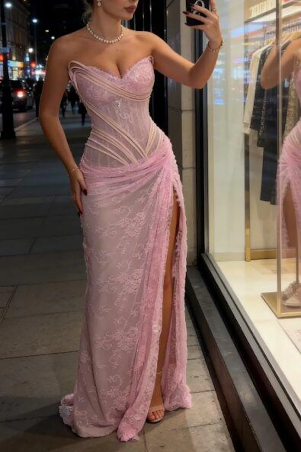 Glam Pink Sheath Long Prom Dresses Lace Sweetheart Evening Dresses with Slits Sleeveless Formal Dresses ED05733