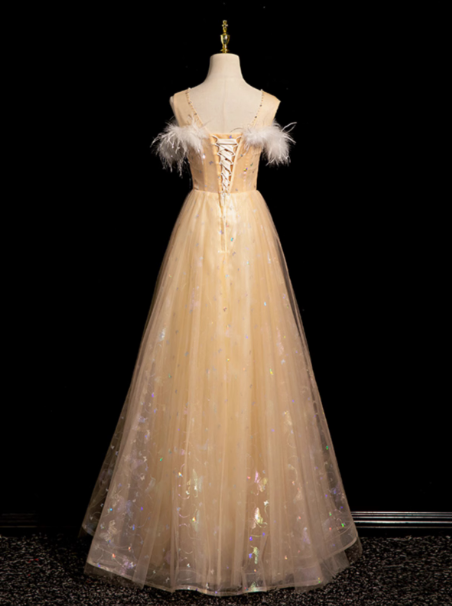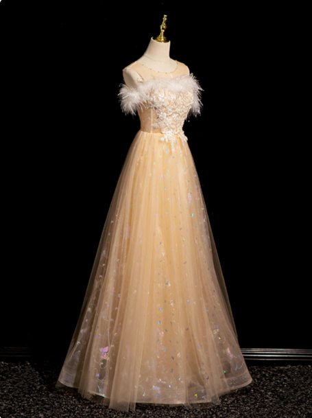 A-line Crew Neck Tulle Embroider Sequins Long Prom Dress, Dark Champagne Formal Dress ED01271