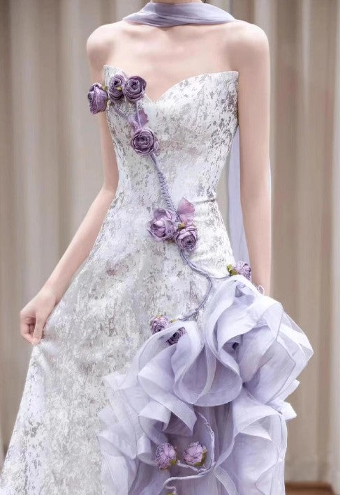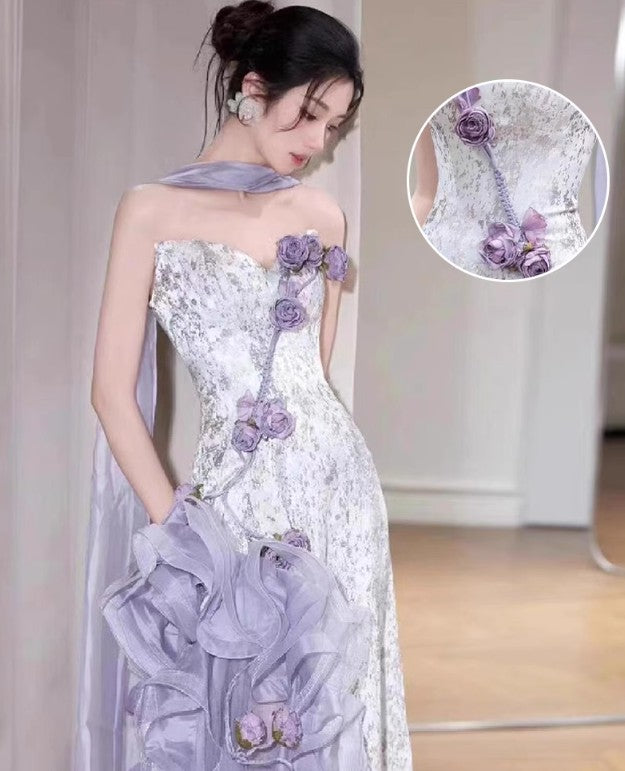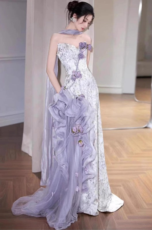 Elegant Purple Mermaid Strapless Satin Tulle Long Prom Dress Applique Evening Gown ED01693