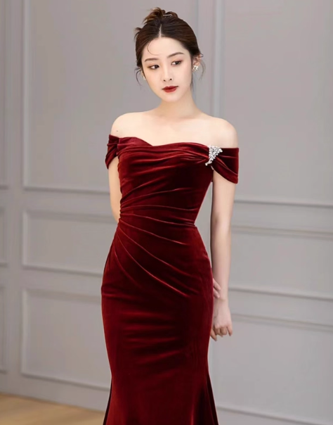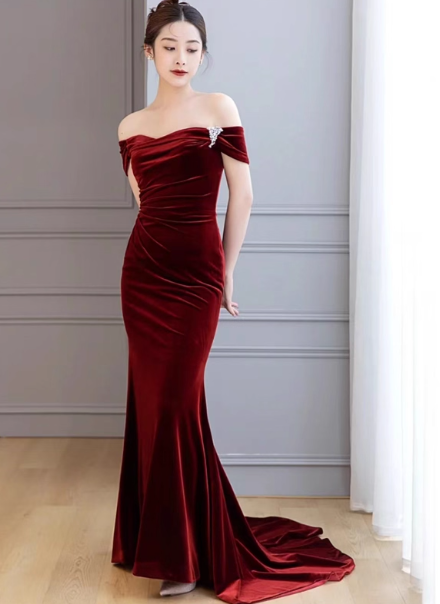 Mermaid Velvet Burgundy Long Prom Dress, Burgundy Long Formal Dress ED012