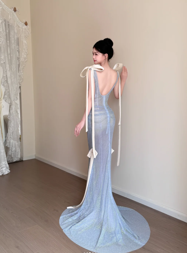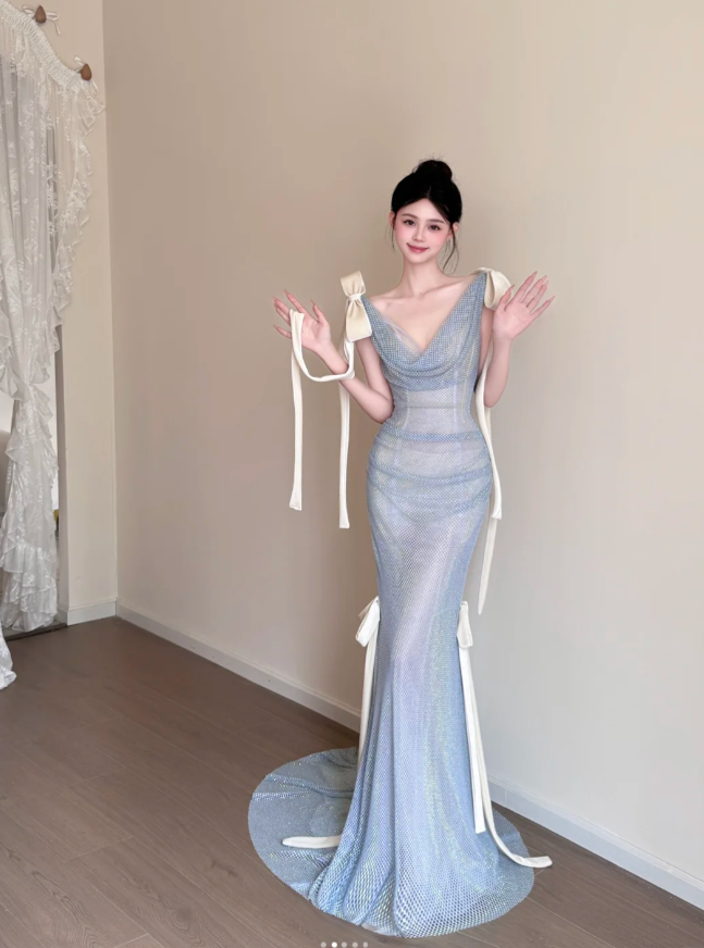 Elegant Mermaid Blue Long Prom Dresses V-neck Blue Birthday Dresses Tulle Sleeveless Evening Dresses ED05463