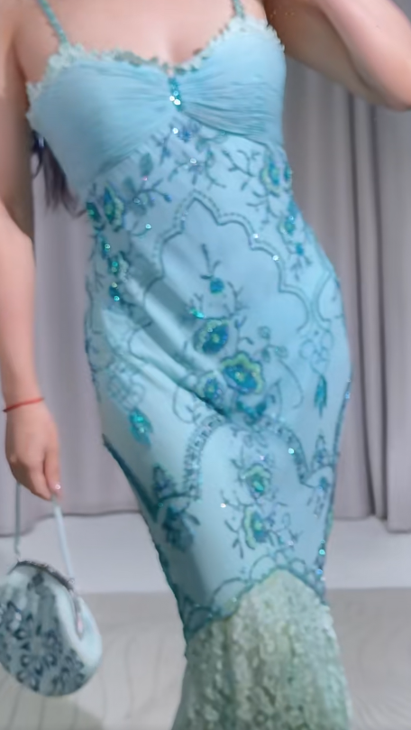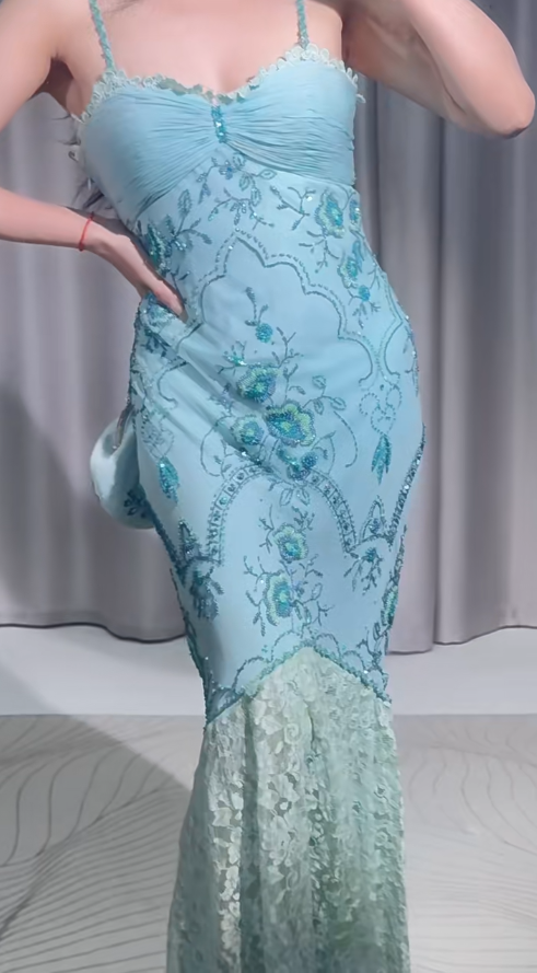 Vintage Mermaid Prom Dress Spaghetti Straps Beaded Lace Sleeveless Formal Dresses Blue Long Evening Dresses ED05394