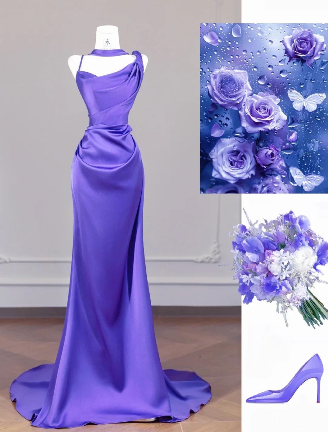 Robe de soirée élégante en satin violet à bretelles style sirène, dos nu, longue, ED02311
