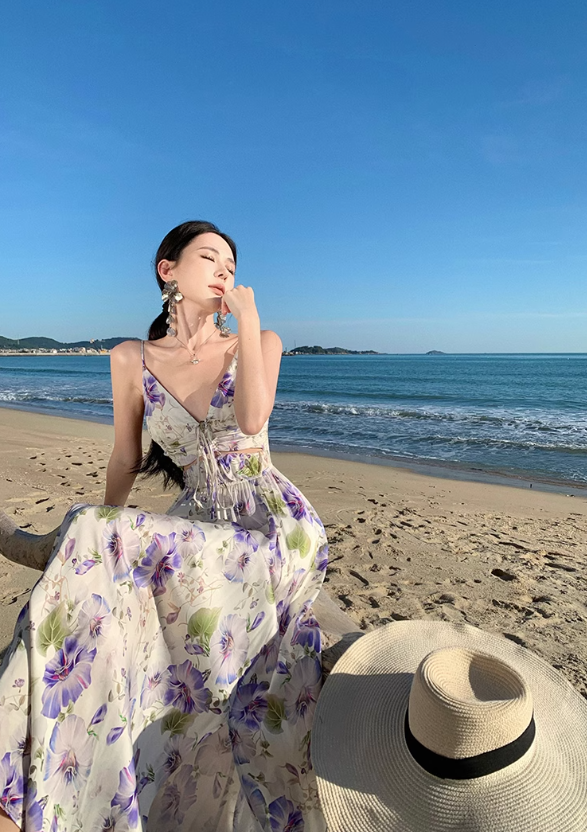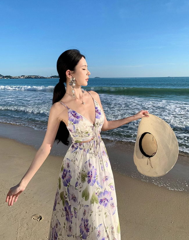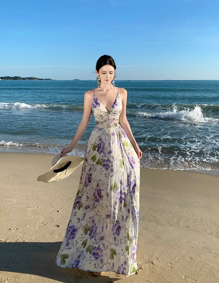 Robe vintage à bretelles et col en V, imprimée violette ED01195