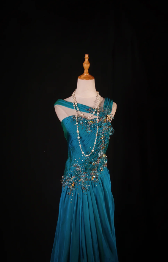 Chic Blue Long Prom Dresses Sheath Irregular Collar Birthday Dresses Beaded Satin Sleeveless Evening Dresse EP06045