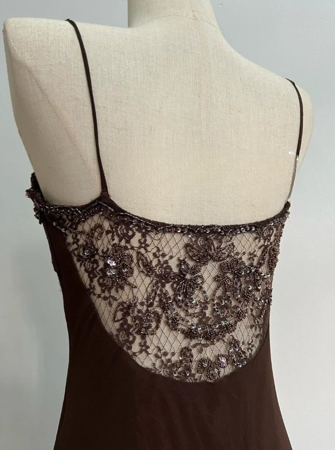 Chic Brown Long Prom Dresses Sheath Spaghetti Straps Birthday Dresses Beaded Chiffon Sleeveless Evening Dresses EP06044