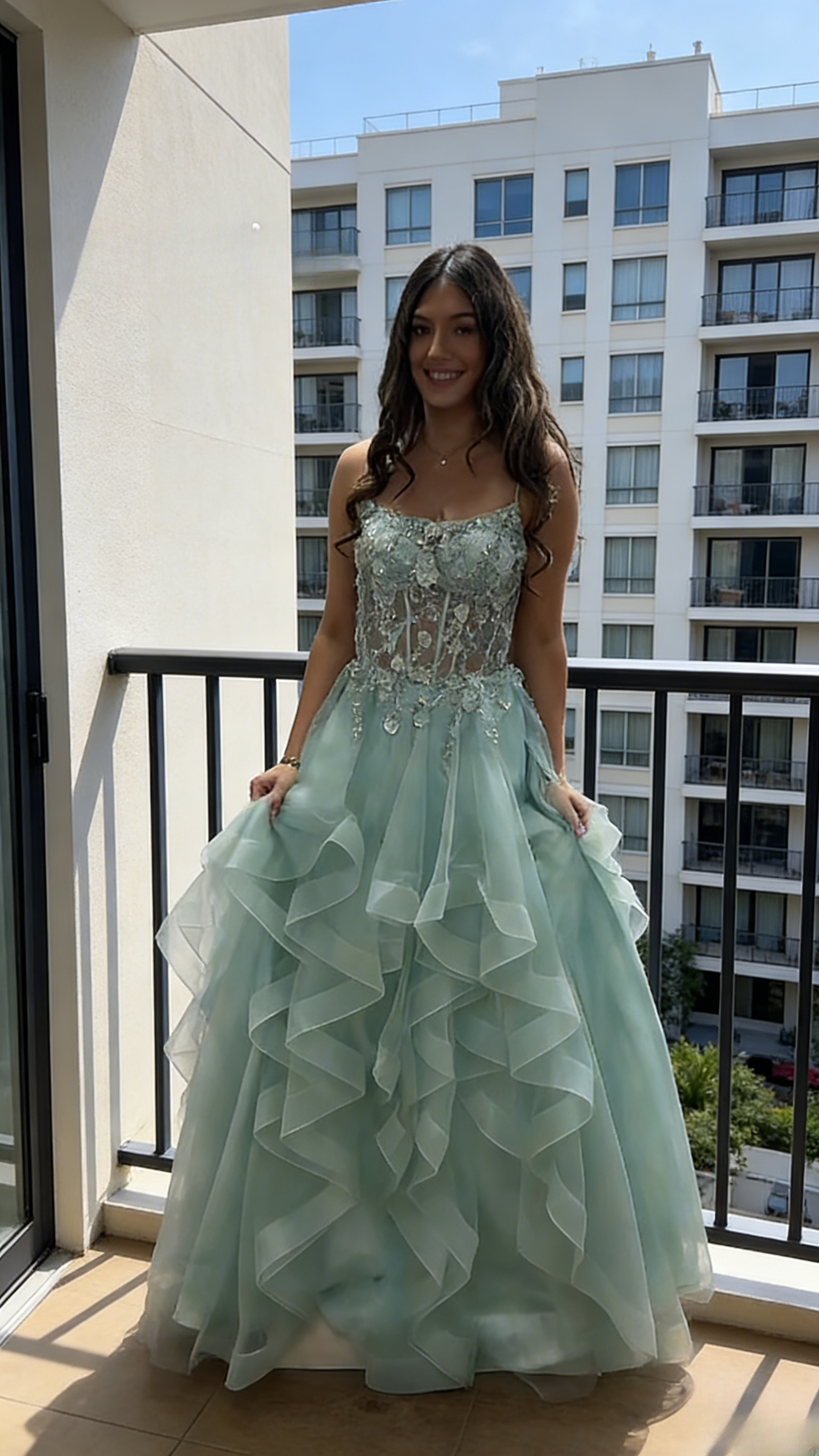 Chic Mint Green Prom Dress Tulle Appliques A-Line Evening Dress Spaghetti Straps Birthday Dress ED06909