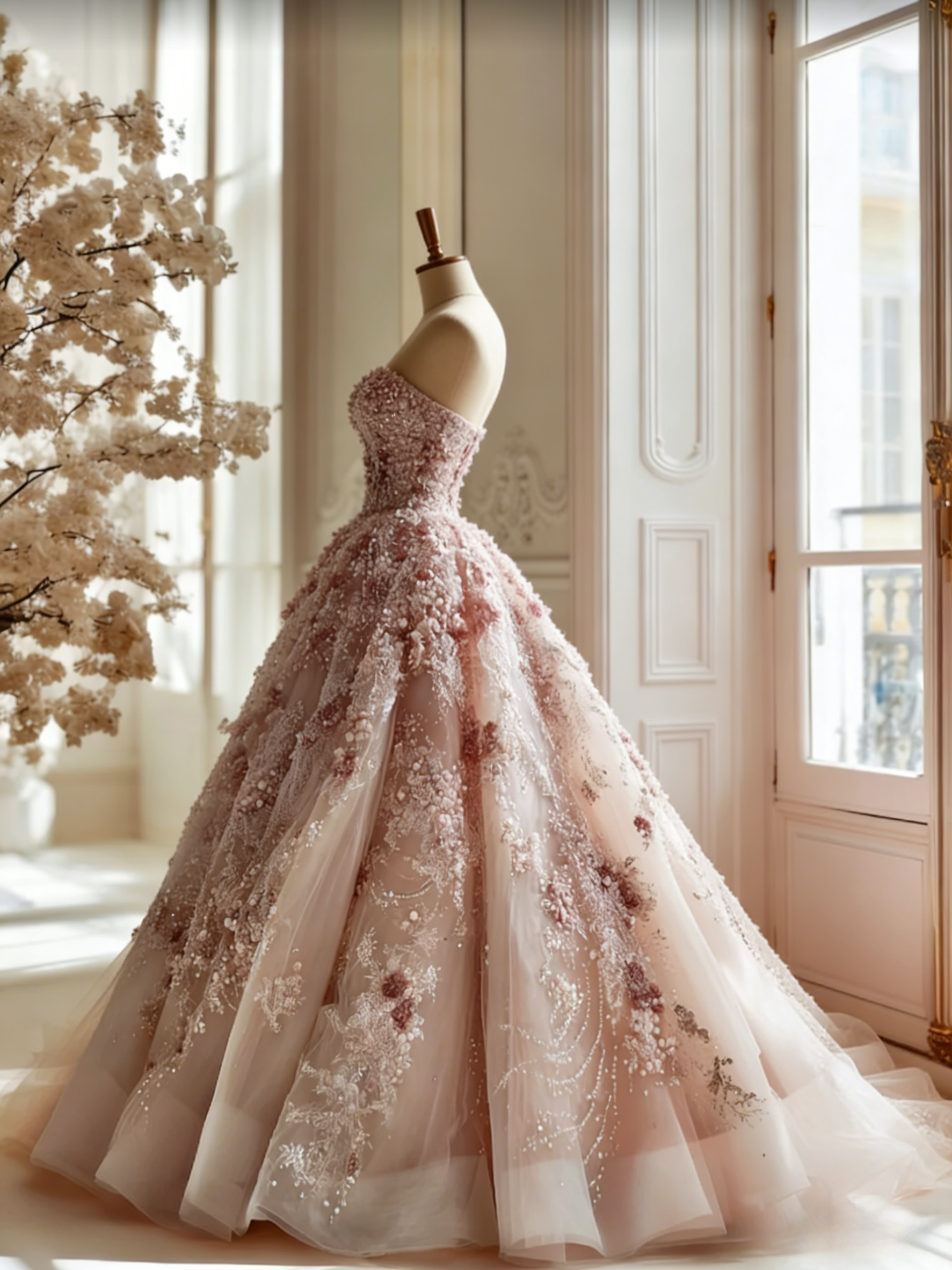 Chic Pink Long Prom Dresses Beaded Appliques Tulle Sweetheart A-Line Evening Dresses ED06151