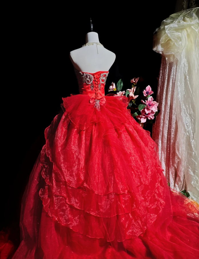 Chic Red Long Prom Dresses Applique Tulle Strapless A-Line Quinceanera Dresses Sleeveless Sweet 16 Dresses ED06162