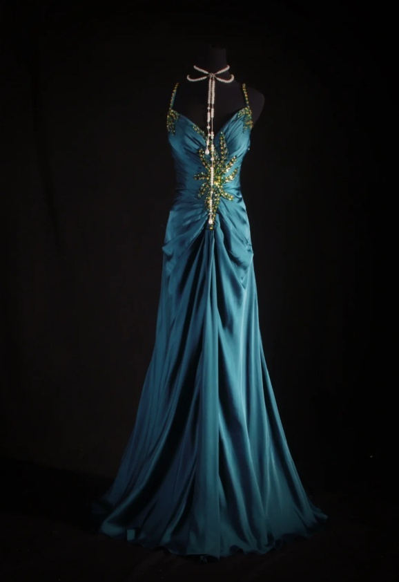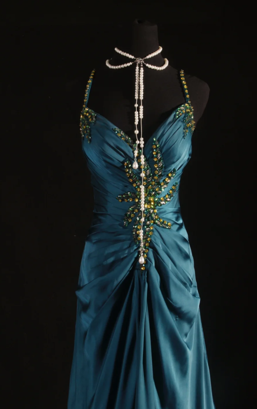Chic Teal Long Prom Dresses Spaghetti Straps Sheath Evening Dresses Beaded Satin Sleeveless Party Dresses ED06128