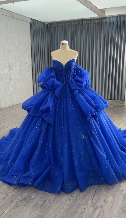 Cute Royal Blue Sweet 16 Dresses, Off-shulder A-Line Long Prom Dresses, Tulle Cups Sleeves Quinceanera Dresses EP06509