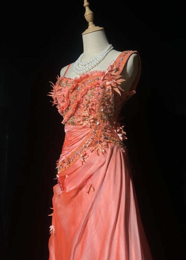 Cute Sheath Long Prom Dresses Coral Birthday Dresses Appliques Satin Straps Evening Dresses ED05960