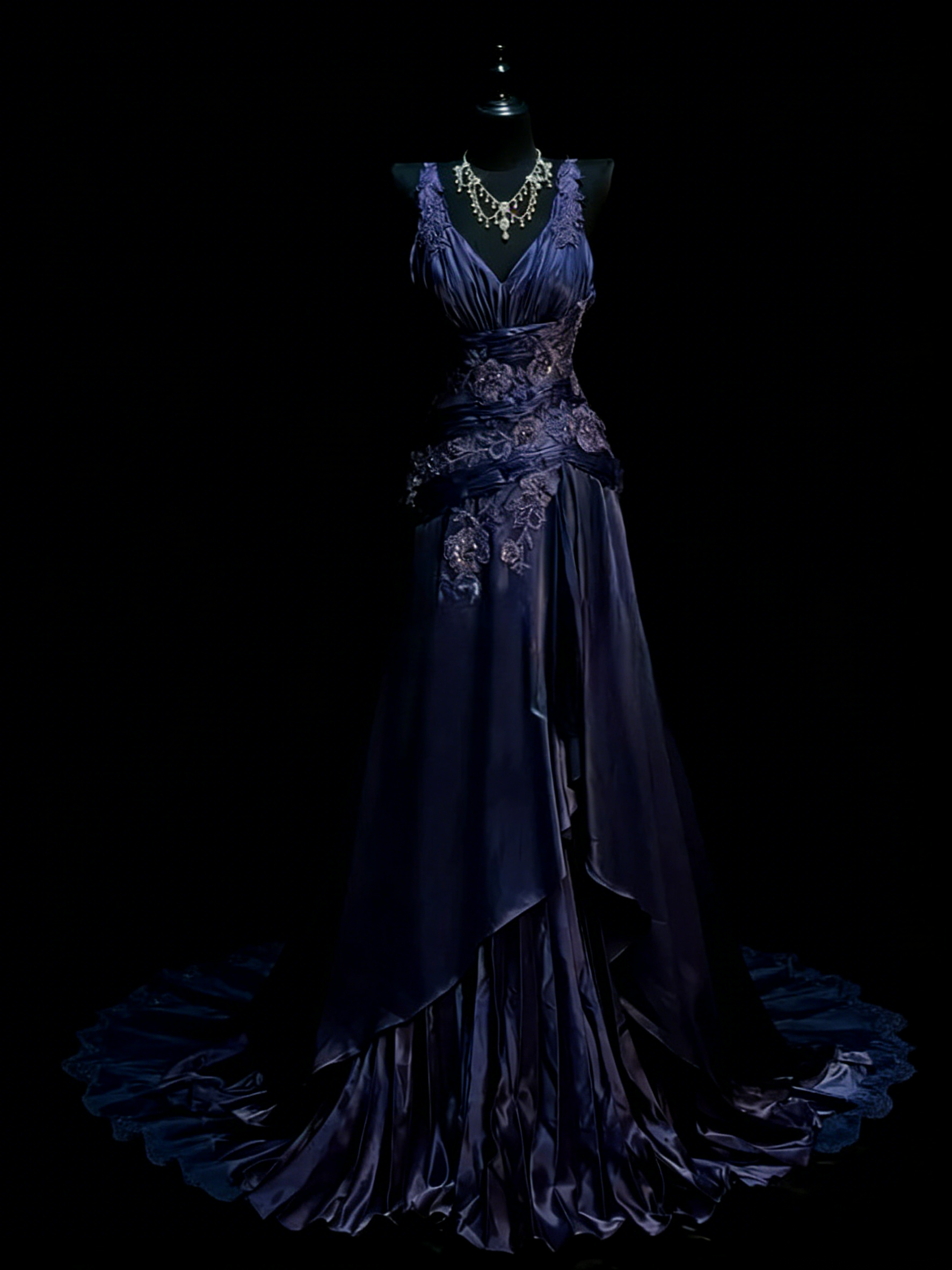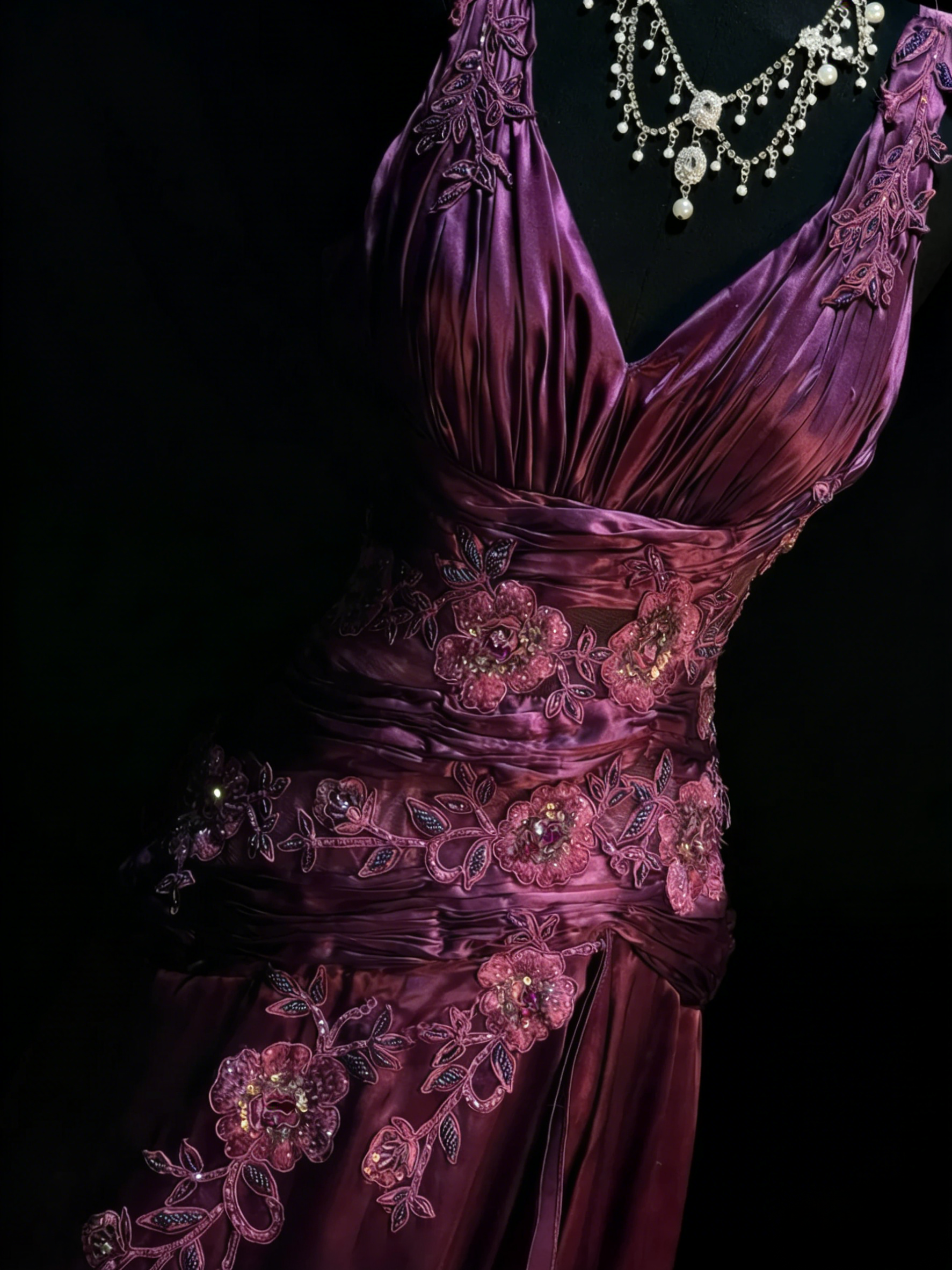Elegant Grape Long Prom Dresses Satin V-neck A-line Evening Dresses Appliques Sleeveless Formal Dresses ED06169