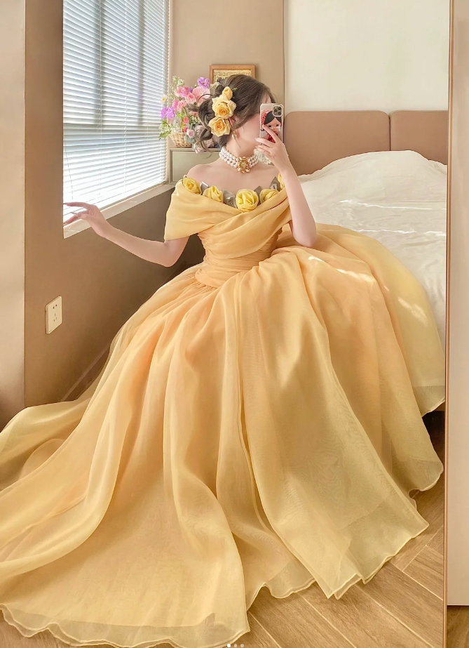 Fairy A-Line Yellow Long Prom Dresses Tulle Off-shoulder Birthday Dresses ED05930