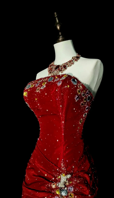 Glam Burgundy Long Prom Dresses Strapless Mermaid Evening Dresses Beaded Satin Sleeveless Formal Dresses EP06802