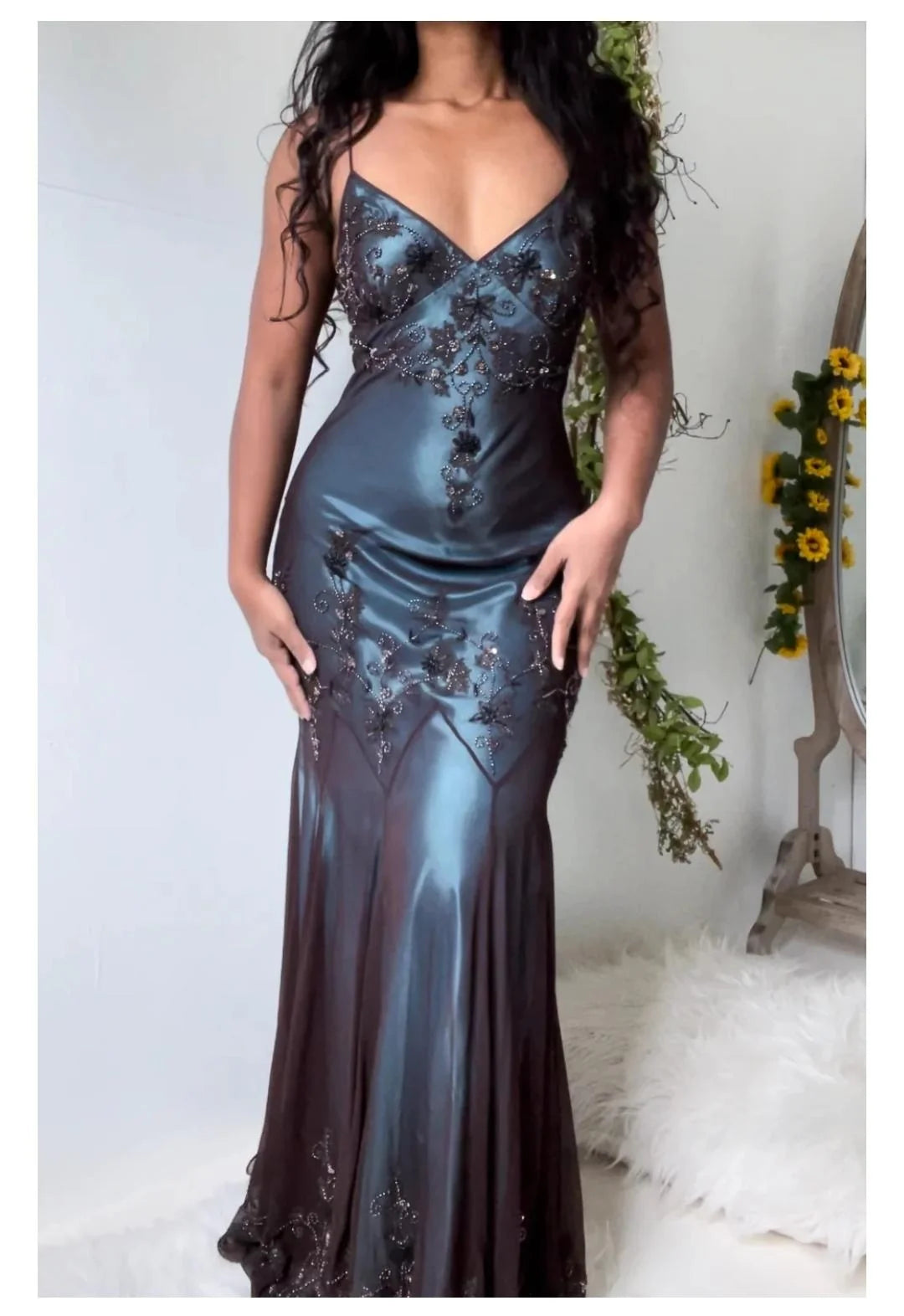 vintage-Inspired Evening Dresses 🩵 Blue Satin Spaghetti Straps Coffee Chiffon Long Prom Dresses with Beading ED01469