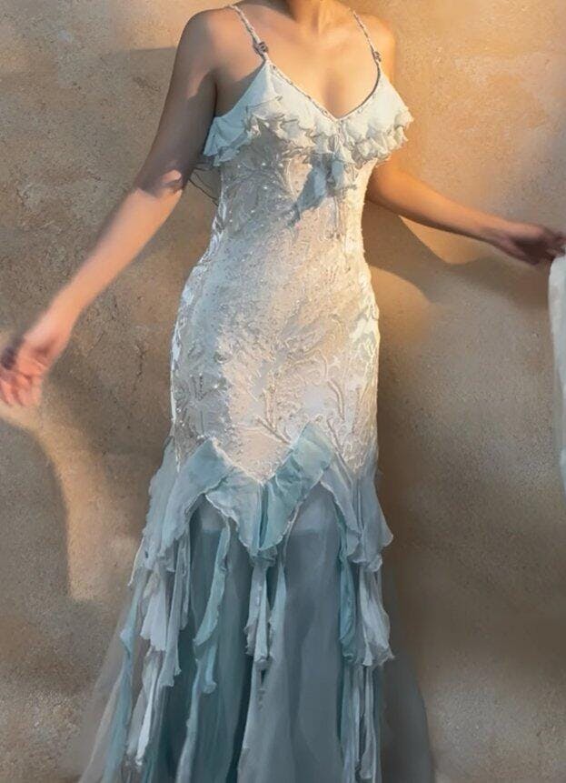Romantic Vintage Mint Green Chiffon Mermaid Beaded Long Prom Dresses Ruffled Fairytale Birthday Dresses ED01725