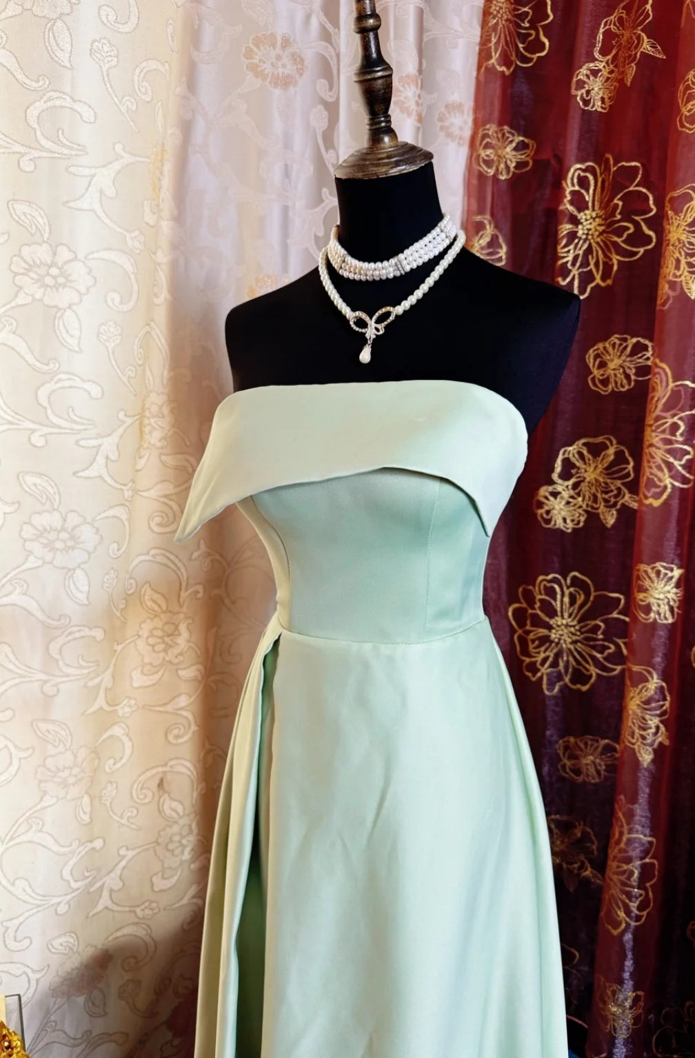 Simple Sheath Strapless Long Evening Dresses Satin Green Bridesmaid Dresses ED05521