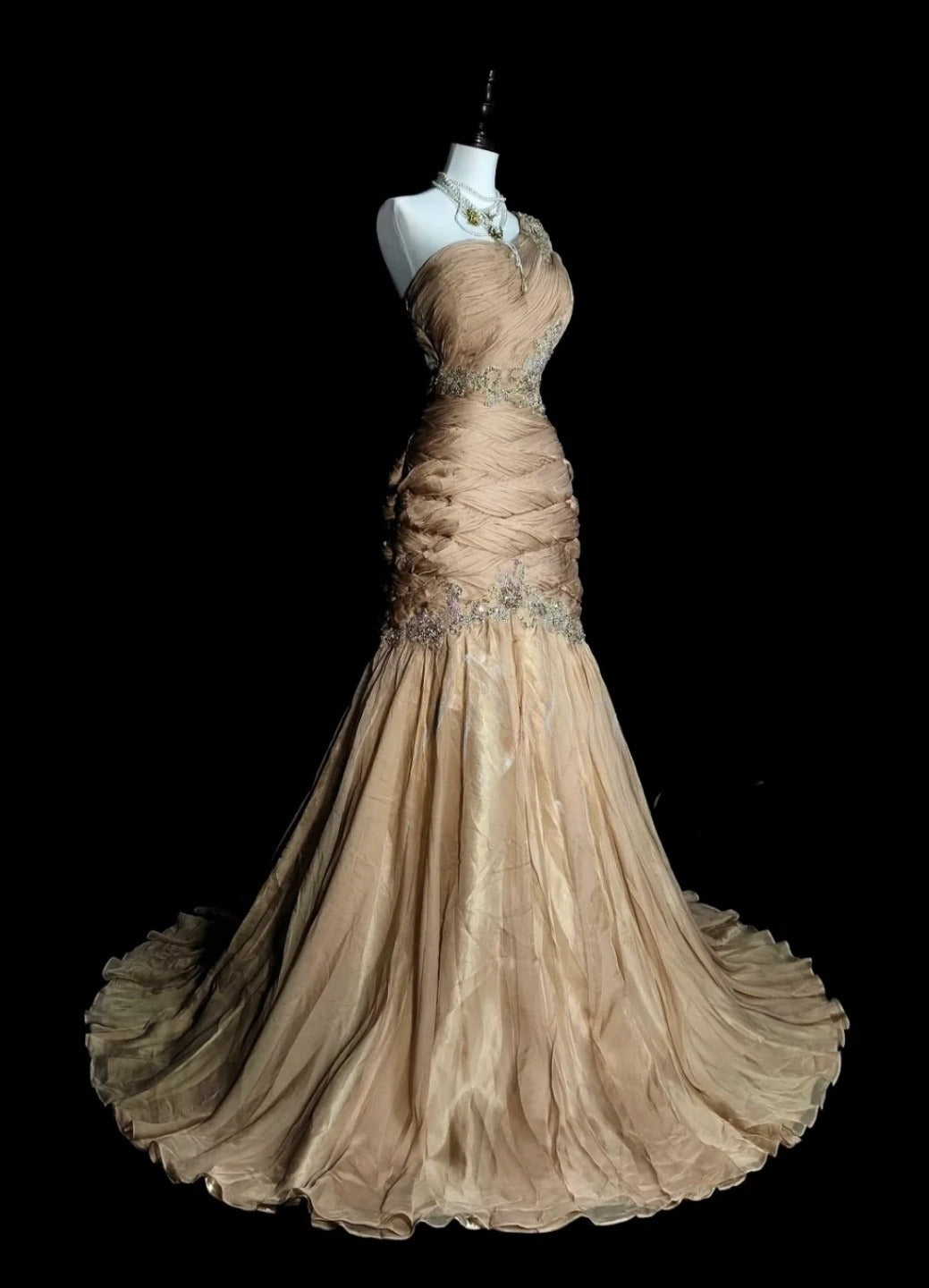 Vintage Champagne Prom Dresses One-shoulder Sheath Long Evening Dress Pleated Tulle Sleeveless Formal Dress ED06739