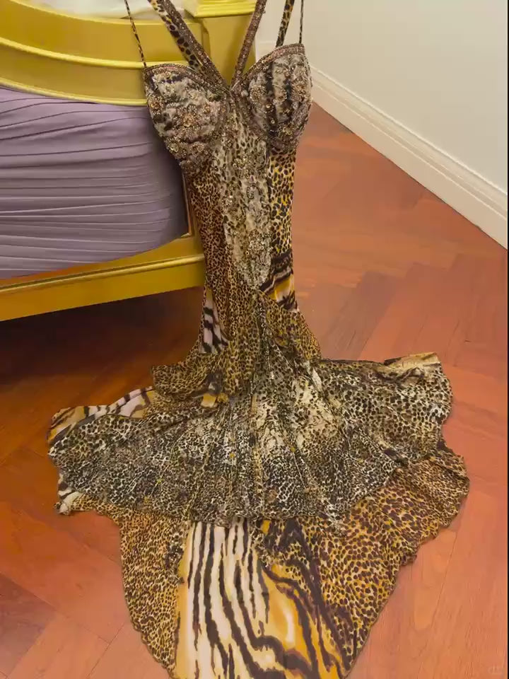 Vintage Sheath Leopard Short Prom Dresses Chiffon Beaded Spaghetti Straps Evening Dresses ED06041