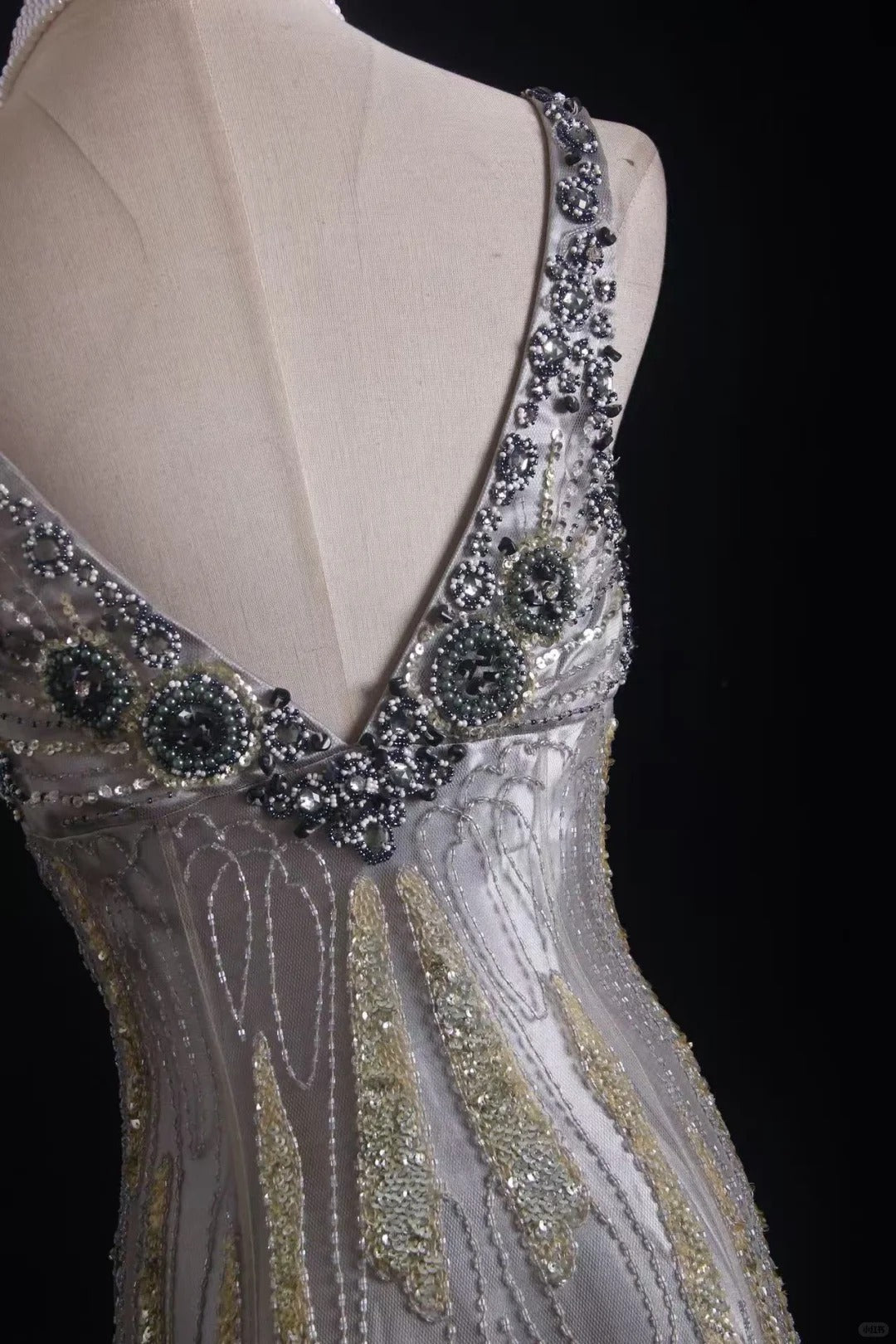 Vintage Sheath V-neck Silk Beaded Long Evening Gowns,Sequined Tulle Light Grey Formal Dresses Gorgeous Prom Dress ED03799