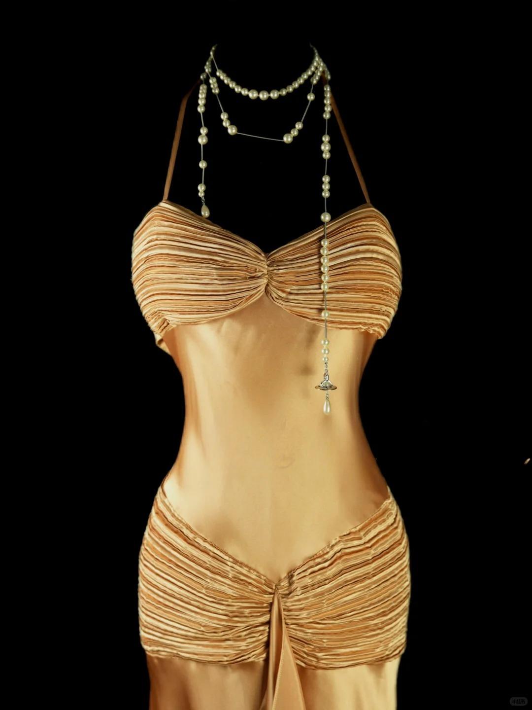 Vintage Yellow Long Prom Dresses Sheath Satin Sleeveless Evening Dresses Halter Birthday Dresses EP06116